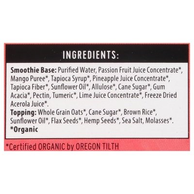 INGREDIENTS: Smoothie Base: Purified Water, Passion Fruit Juice Concentrate (Organic), Mango Puree (Organic), Tapioca Syrup (Organic), Pineapple Juice Concentrate (Organic), Tapioca Fiber (Organic), Sunflower Oil (Organic), Allulose (Organic), Cane Sugar (Organic), Gum Acacia (Organic), Pectin, Turmeric (Organic), Lime Juice Concentrate (Organic), Freeze Dried Acerola Juice (Organic). Topping: Whole Grain Oats (Organic), Cane Sugar (Organic), Brown Rice, Sunflower Oil (Organic), Flax Seeds (Organic), Hemp Seeds (Organic), Sea Salt, Molasses (Organic).