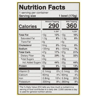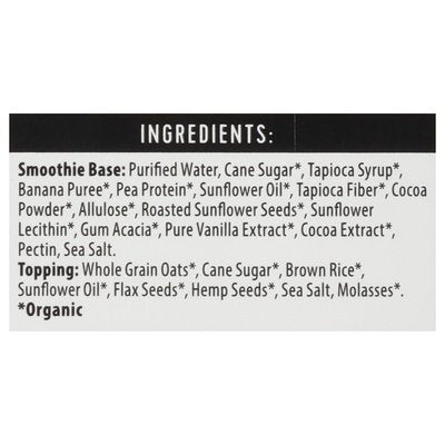 INGREDIENTS: Smoothie Base: Purified Water, Cane Sugar (Organic), Tapioca Syrup (Organic), Banana Puree (Organic), Pea Protein (Organic), Sunflower Oil (Organic), Tapioca Fiber (Organic), Cocoa Powder (Organic), Allulose (Organic), Roasted Sunflower Seeds (Organic), Sunflower Lecithin (Organic), Gum Acacia (Organic), Pure Vanilla Extract (Organic), Cocoa Extract (Organic), Pectin, Sea Salt. Topping: Whole Grain Oats (Organic), Cane Sugar (Organic), Brown Rice (Organic), Sunflower Oil (Organic), Flax Seeds (Organic), Hemp Seeds (Organic), Sea Salt, Molasses (Organic).