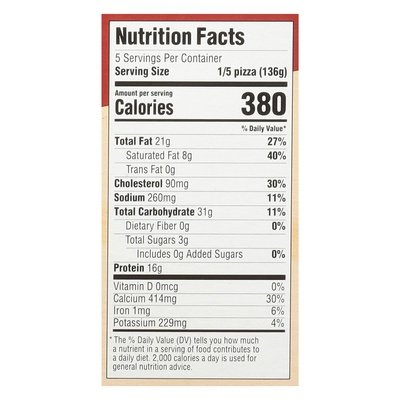 INGREDIENTS: Crust: Tapioca Starch, Milk, Eggs, Canola Oil, Cheddar Cheese (Fresh Pasteurized Milk, Cheese Cultures, Salt, Enzymes), Mozzarella Cheese (Pasteurized Milk, Cheese Culture, Salt, Enzymes), Parmesan Cheese (Pasteurized Milk, Cheese Culture, Salt, Enzymes). Topping: Tomato Puree (Fresh Vine-Ripened California Tomatoes, Citric Acid), Mozzarella Cheese (Pasteurized Milk, Cheese Culture, Salt, Enzymes), Parmesan Cheese (Pasteurized Milk, Cheese Culture, Salt, Enzymes), Uncured Pepperoni (Pork, Beef, Salt, Contains Less than 2%: Mustard, Sugar, Spice Extractive of Paprika (Color), Spice Extractives, Garlic Powder, Citric Acid, Lactic Acid Starter Culture, Celery Powder, No Nitrite or Nitrate Added Except for Naturally Occuring in Celery Powder).