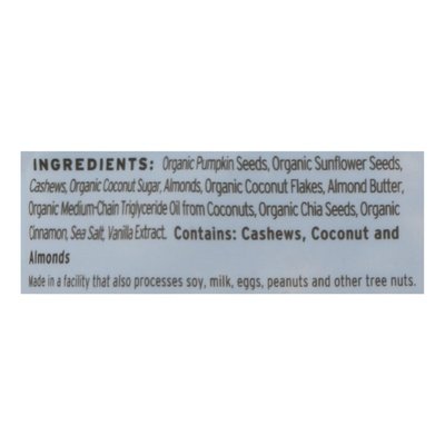 INGREDIENTS: Organic Pumpkin Seeds, Organic Sunflower Seeds, Cashews, Organic Coconut Sugar, Almonds, Organic Coconut Flakes, Almond Butter, Organic Medium-Chain Triglyceride Oil from Coconuts, Organic Chia Seeds, Organic Cinnamon, Sea Salt, Vanilla Extract.