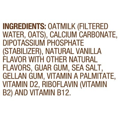 INGREDIENTS: Oatmilk (Filtered Water, Oats), Calcium Carbonate, Dipotassium Phosphate (Stabilizer), Natural Vanilla Flavor with Other Natural Flavors, Guar Gum, Sea Salt, Gellan Gum, Vitamin A Palmitate, Vitamin D2, Riboflavin (Vitamin B2) and Vitamin B12.