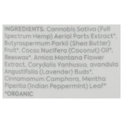 INGREDIENTS: Cannabis Sativa (Full Spectrum Hemp) Aerial Parts Extract (Organic), Butyrospermum Parkii (Shea Butter) Fruit (Organic), Cocos Nucifera (Coconut) Oil (Organic), Beeswax (Organic), Arnica Montana Flower Extract, Corydalis Yanhusua, Avandula Angustifolia (Lavender) Buds (Organic), Cinnamon Camphora, Mentha Piperita (Indian Peppermint) Leaf (Organic).