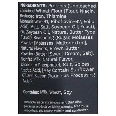 DESCRIPTION: These are bold snacks. Made with big hearts. Hand seasoned in small batches. Made with flavor so bold it's lipsmacking fingerlicking goodness and crunch. Pop daddy. How do we fit so much flavour in one bag? At pop daddy, we're all about crave-worthy, crunchy snacks that pack a punch in the flavour department. We don't shy away from zesty, different, and downright tasty. So be it popcorn or pretzels, you can count on us for a snacking experience that seriously satisfies. These are bold snacks. Product of USA < Pretzels (Unbleached Enriched Wheat Flour [Flour, Niacin, Reduced Iron, Thiamine Mononitrateb1, Riboflavin-B2, Folic Acid], Malt, Salt, Soybean Oil, Yeast), Oil, 9Soybean Oil, Natural Butter Type Flavor), Seasoning (Sugar, Molasses Powder [ Molasses, Maltodextrin], Natural Flavors, Brown Butter Powder (Butter [ Sweet Cream, Salt], Nonfat Milk, Natural Flavor, Disodium Phosphate), Salt, Spices, Lactic Acid, [ May Contain Sunflower Oil And Silicon Dioxide As Processing Aids]).