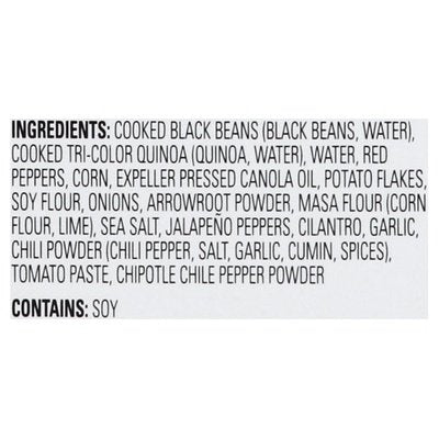 INGREDIENTS: Cooked Black Beans (Black Beans, Water), Cooked Tri-Color Quinoa, Water), Water, Red Peppers, Corn, Expeller Pressed Canola Oil, Potato Flakes, Soy Flour, Onions, Arrowroot Powder, Masa Flour (Corn Flour, Lime), Sea Salt, Jalapeno Peppers, Cilantro, Garlic, Chili Powder (Chili Pepper, Salt, Garlic, Cumin, Spices), Tomato Paste, Chipotle Chile Pepper Powder.