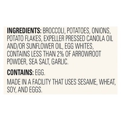 INGREDIENTS: Broccoli, Potatoes, Onions, Expeller Pressed Canola Oil, Potato Flakes, Egg Whites, Arrowroot Powder, Sea Salt, Garlic.