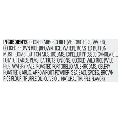 INGREDIENTS: Cooked Arborio Rice (Arborio Rice, Water), Cooked Brown Rice (Brown Rice, Water), Roasted Button Mushrooms, Button Mushrooms, Expeller Pressed Canola Oil, Potato Flakes, Peas, Carrots, Onions, Cooked Wild Rice (Wild Rice, Water), Kale, Roasted Portobello Mushrooms, Celery, Roasted Garlic, Arrowroot Powder, Sea Salt, Spices, Brown Rice Flour, Truffle Oil (Olive Oil, Natural Truffle Flavor).