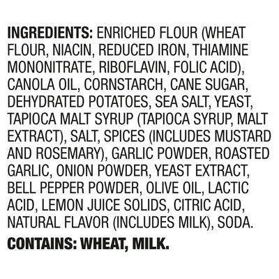 INGREDIENTS: Enriched Flour (Wheat Flour, Niacin, Reduced Iron, Thiamine Mononitrate, Riboflavin, Folic Acid), Canola Oil, Cornstarch, Cane Sugar, Dehydrated Potatoes, Sea Salt, Yeast, Tapioca Malt Syrup (Tapioca Syrup, Malt Extract), Salt, Spices (Includes Mustard and Rosemary), Garlic Powder, Roasted Garlic, Onion Powder, Yeast Extract, Bell Pepper Powder, Olive Oil, Lactic Acid, Lemon Juice Solids, Citric Acid, Natural Flavor (Includes Milk), Soda.