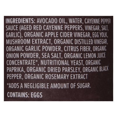 INGREDIENTS: Avocado Oil, Water, Cayenne Pepper Sauce (Aged Red Cayenne Peppers, Vinegar, Salt, Garlic), Organic Apple Cider Vinegar, Egg Yolk, Mushroom Extract, Organic Distilled Vinegar, Organic Garlic Powder, Citrus Fiber, Organic Onion Powder, Sea Salt, Organic Lemon Juice Concentrate (Adds a Negligible Amount of Sugar), Nutritional Yeast, Organic Paprika, Organic Dried Parsley, Organic Black Pepper, Organic Rosemary Extract.