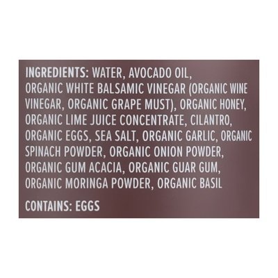 INGREDIENTS: Water, Avocado Oil, Organic White Balsamic Vinegar (Organic Wine Vinegar, Organic Grape Must), Organic Honey, Organic Lime Juice Concentrate, Cilantro, Organic Eggs, Sea Salt, Organic Garlic, Organic Spinach Powder, Organic Onion Powder, Organic Gum Acacia, Organic Guar Gum, Organic Moringa Powder, Organic Basil.