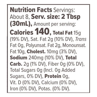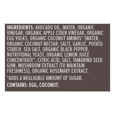 INGREDIENTS: Avocado Oil, Water, Organic Apple Cider Vinegar, Organic Egg Yolk, Organic Coconut Aminos (Adds a Negligible Amount of Sugar) (Organic Coconut Syrup, Himalayan Salt), Potato Starch, Organic Distilled Vinegar, Garlic Puree, Mushroom Extract (to Maintain Freshness), Sea Salt, Organic Black Pepper, Nutritional Yeast (Inactive Dried Yeast, Riboflavin [Vitamin B2]), Organic Lemon Juice Concentrate (Adds a Negligible Amount of Sugar), Organic Garlic Powder, Tamarind Seed Gum, Salt, Organic Rosemary Extract.