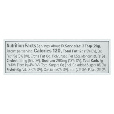 INGREDIENTS: Avocado Oil, Water, Organic Apple Cider Vinegar, Egg Yolk, Sea Salt, Organic Distilled Vinegar, Citrus Fiber, Tamarind Seed Gum, Cream of Tartar, Mushroom Extract, Organic Onion Powder, Organic Garlic Powder, Organic Lemon Juice Concentrate (Adds a Negligible Amount of Sugar), Nutritional Yeast, Organic Parsley, Organic Chives, Organic Dill, Organic Black Pepper, Organic Rosemary Extract.