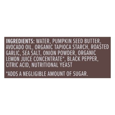INGREDIENTS: Water, Pumpkin Seed Butter, Avocado Oil, Organic Tapioca Starch, Roasted Garlic, Sea Salt, Onion Powder, Organic Lemon Juice Concentrate (Add a Negligible Amount of Sugar), Black Pepper, Citric Acid, Nutritional Yeast.