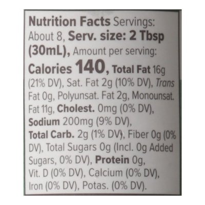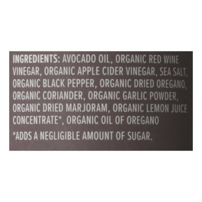 INGREDIENTS: Avocado Oil, Organic Red Wine Vinegar, Organic Apple Cider Vinegar, Sea Salt, Organic Black Pepper, Organic Dried Oregano, Organic Coriander, Organic Garlic Powder, Organic Dried Marjoram, Organic Lemon Juice Concentrate (Adds a Negligible Amount of Sugar), Organic Oil of Oregano.
