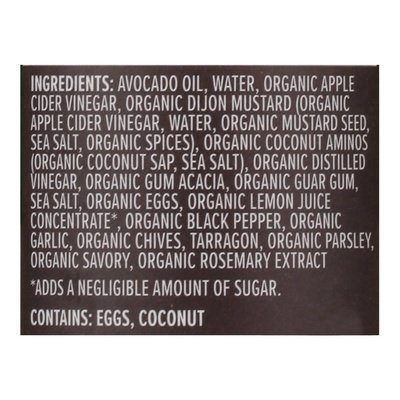 INGREDIENTS: Avocado Oil, Water, Organic Apple Cider Vinegar, Organic Dijon Mustard (Organic Apple Cider Vinegar, Water, Organic Mustard Seed, Sea Salt, Organic Spices), Organic Coconut Aminos (Organic Coconut Sap, Sea Salt), Organic Distilled Vinegar, Organic Gum Acacia, Organic Guar Gum, Sea Salt, Organic Eggs, Organic Lemon Juice Concentrate (Adds a Negligible Amount of Sugar), Organic Black Pepper, Organic Garlic, Organic Chives, Tarragon, Organic Parsley, Organic Savory, Organic Rosemary Extract.