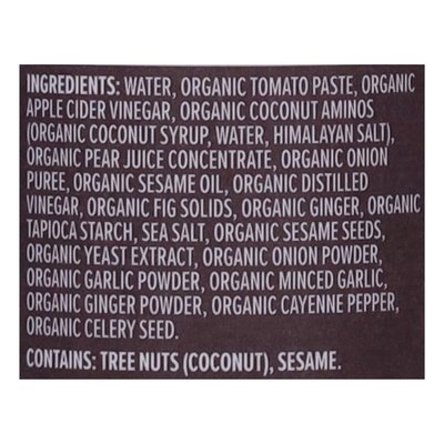 DESCRIPTION: USDA Organic. Certified gluten free. gfco.org. Paleo. Certified Organic by QAI. No soy. Keto. This product is Keto certified. ketocertified.com. Non-GMO Project verified. nongmoproject.org. No artificial sweeteners. No cane sugar. Eat like your life depends on it. I created Primal Kitchen because I believe flavorful food uplifts and empowers us. Made from real ingredients without compromise, our products add variety and flavor so every single bite is delicious. Never settle: make every meal exciting. - Mark Sisson, Founder. Whole 30 Approved. Let's get social! (at)primalkitchenfoods. Let's cook! primalkitchen.com/recipes. 1-888-774-6259. < Water, Organic Tomato Paste, Organic Apple Cider Vinegar, Organic Coconut Aminos (Organic Coconut Syrup, Water, Himalayan Salt), Organic Pear Juice Concentrate, Organic Onion Puree, Organic Sesame Oil, Organic Distilled Vinegar, Organic Fig Solids, Organic Ginger, Organic Tapioca Starch, Sea Salt, Organic Sesame Seeds, Organic Yeast Extract, Organic Onion Powder, Organic Garlic Powder, Organic Minced Garlic, Organic Ginger Powder, Organic Cayenne Pepper, Organic Celery Seed.