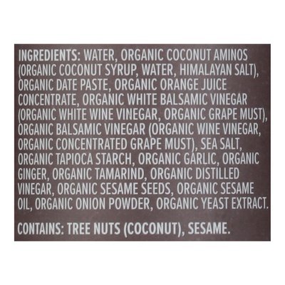 INGREDIENTS: Water, Organic Coconut Aminos (Organic Coconut Syrup, Water, Himalayan Salt), Organic Date Paste, Organic Orange Juice Concentrate, Organic White Balsamic Vinegar (Organic White Wine Vinegar, Organic Grape Must), Organic Balsamic Vinegar (Organic Wine Vinegar, Organic Concentrated Grape Must), Sea Salt, Organic Tapioca Starch, Organic Garlic, Organic Ginger, Organic Tamarind, Organic Distilled Vinegar, Organic Sesame Seeds, Organic Sesame Oil, Organic Onion Powder, Organic Yeast Extract.