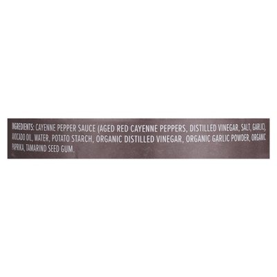 INGREDIENTS: Cayenne Pepper Sauce (Aged Red Cayenne Peppers, Distilled Vinegar, Salt, Garlic), Avocado Oil, Water, Potato Starch, Organic Distilled Vinegar, Organic Garlic Powder, Organic Paprika, Tamarind Seed Gum.