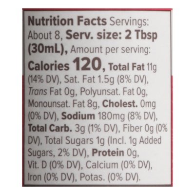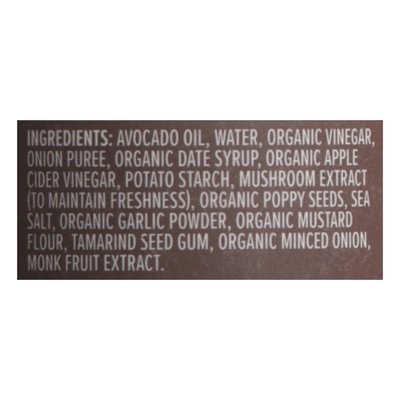 INGREDIENTS: Avocado Oil, Water, Organic Vinegar, Onion Puree, Organic Date Syrup, Organic Apple Cider Vinegar, Potato Starch, Mushroom Extract (to Maintain Freshness), Organic Poppy Seeds, Sea Salt, Organic Garlic Powder, Organic Mustard Flour, Tamarind Seed Gum, Organic Minced Onion, Monk Fruit Extract.