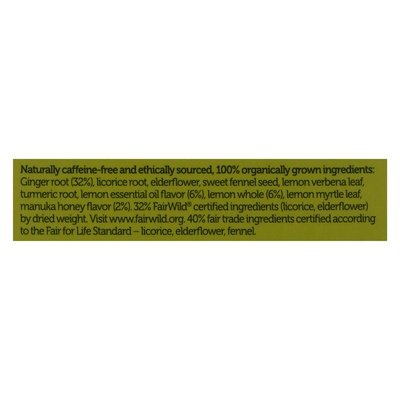 INGREDIENTS: Naturally Caffeine-Free and Ethically Sourced, 100% Organically Grown Ingredients: Ginger Root (32%), Licorice Root, Elderflower, Sweet Fennel Seed, Lemon Verbena Leaf, Turmeric Root, Lemon Essential Oil Flavor (6%), Lemon Whole (6%), Lemon Myrtle Leaf, Manuka Honey Flavor (2%), 32% FairWild Certified Ingredients (Licorice, Elderflower) by Dried Weight, Visit www.fairwild.org. 40% Fair Trade Ingredients Certified According to the Fair for Life Standard - Licorice, Elderflower, Fennel.