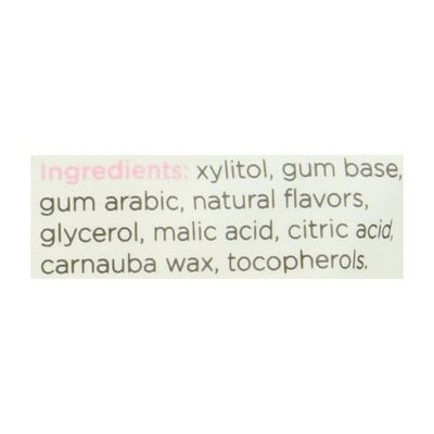 INGREDIENTS: Xylitol, Gum Base, Gum Arabic, Natural Flavors, Glycerol, Malic Acid, Citric Acid, Carnauba Wax, Tocopherols.