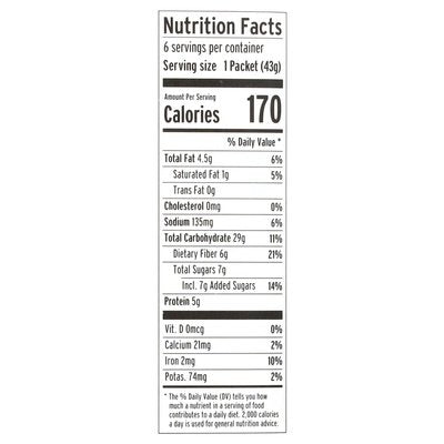 INGREDIENTS: Organic Certified Gluten-Free Oats, Organic Coconut Sugar, Organic Fair Trade Dark Chocolate Chunks (Organic Cane Sugar, Organic Chocolate Liquor, Organic Cocoa Butter, Organic Vanilla Extract), Organic Flax Seeds, Organic Chia Seeds, Chicory Root Powder, Sea Salt, Organic Quinoa Flakes, Organic Puffed Amaranth.