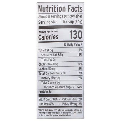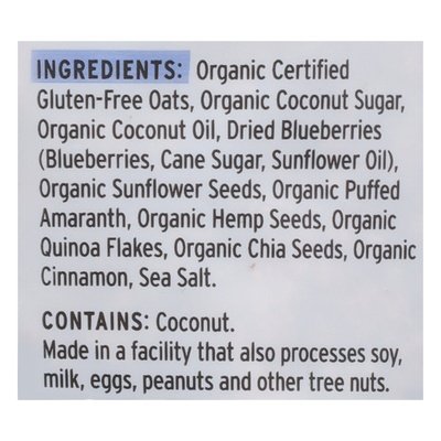 INGREDIENTS: Organic Certified Gluten-Free Oats, Organic Coconut Sugar, Organic Coconut Oil, Dried Blueberries (Blueberries, Cane Sugar, Sunflower Oil), Organic Sunflower Seeds, Organic Puffed Amaranth, Organic Hemp Seeds, Organic Quinoa Flakes, Organic Chia Seeds, Organic Cinnamon, Sea Salt.