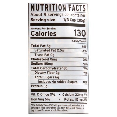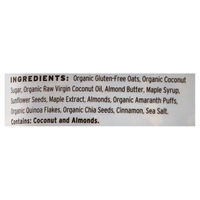 INGREDIENTS: Organic Certified Gluten-Free Oats, Organic Coconut Sugar, Organic Coconut Oil, Maple Syrup, Almond Butter, Sunflower Seeds, Almonds, Organic Amaranth Puffs, Organic Quinoa Flakes, Organic Chia Seeds, Cinnamon, Sea Salt.