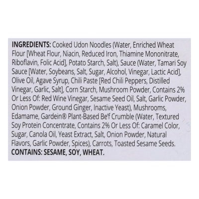 INGREDIENTS: Cooked Udon Noodles (Water, Enriched Wheat Flour [Wheat Flour, Niacin, Reduced Iron, Thiamine Mononitrate, Riboflavin, Folic Acid], Potato Starch, Salt), Sauce (Water, Tamari Soy Sauce [Water, Soybeans, Salt, Sugar, Alcohol, Vinegar, Lactic Acid], Olive Oil, Agave Syrup, Chili Paste [Red Chili Peppers, Distilled Vinegar, Garlic, Salt], Corn Starch, Mushroom Powder, Contains 2% or Less of: Red Wine Vinegar, Sesame Seed Oil, Salt, Garlic Powder, Onion Powder, Ground Ginger. Inactive Yeast), Mushrooms, Edamame, Gardein Plant-Based Be'f Crumble (Water, Textured Soy Protein Concentrate, Contains 2% or Less of: Caramel Color, Sugar, Canola Oil, Yeast Extract, Salt, Onion Powder, Natural Flavors, Garlic Powder, Spices), Carrots, Toasted Sesame Seeds.