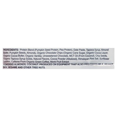 INGREDIENTS: Protein Blend (Pumpkin Seed Protein, Pea Protein), Date Paste, Tapioca Syrup, Almond Butter, Pumpkin Seeds, Almonds, Organic Chocolate Chips (Organic Cane Sugar, Organic Cocoa Liquor, Organic Cocoa Butter, Organic Vanilla), Unsweetened Chocolate, Mct Oil (from Coconut), Chia Seeds, Organic Tapioca Syrup Solids, Natural Flavors, Cocoa Powder (Alkalized), Himalayan Pink Salt, Sunflower Lecithin, Caffeine from Organic Green Coffee, Monk Fruit Extract.