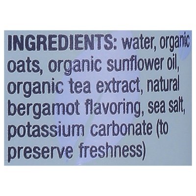 INGREDIENTS: Water, Organic Oats, Organic Sunflower Oil, Organic Tea Extract, Natural Bergamot Flavoring, Sea Salt, Potassium Carbonate (to Preserve Freshness).