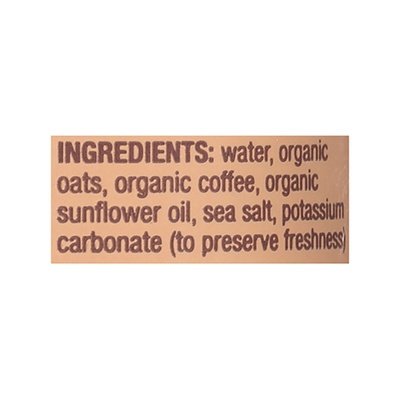 INGREDIENTS: Water, Organic Oats, Organic Coffee, Organic Sunflower Oil, Sea Salt, Potassium Carbonate (to Preserve Freshness).
