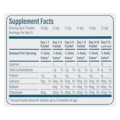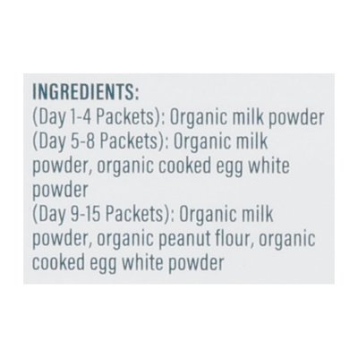 INGREDIENTS: (Day 1-4 Packets): Organic Milk Powder. (Day 5-8 Packets): Organic Milk Powder, Organic Cooked Egg White Powder. (Day 9-15 Packets): Organic Milk Powder, Organic Peanut Flour, Organic Cooked Egg White Powder.