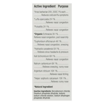 INGREDIENTS: Active Ingredients: Each 20 ml Contains: Argentum Nitricum 10X (1%), Euphorbium Officinarum 4X (1%), Hepar Sulphuris Calcareum 10X (1%), Hydrastis Canadensis 3X (1%), Kali Bichromicum 6X (1%), Luffa Operculata 2X (1%), Natrum Carbonicum 6X (1%), Pulsatilla 2X (1%). Relieves Nasal Itching; Relieves Sneezing, Natural Ingredients; Relieves Runny Nose; Relieves Sinus Headache & Pressure, Natural Ingredients; Relieves Nasal Congestion; Relieves Nasal Congestion, Natural Ingredients; Relieves Sneezing, Runny Nose; Relieves Nasal Congestion, Natural Ingredients. Inactive Ingredients: Benzalkonium Chloride, Disodium Phosphate Dihydrate, Isotonic Sodium Chloride Solution and Sodium Dihydrogen Phosphate Dihydrate.