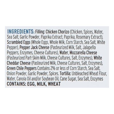 INGREDIENTS: Filling Chicken Chorizo (Chicken, Spices, Water, Sea Salt, Garlic Powder, Paprika Extract, Paprika, Rosemary Extract), Scrambled Eggs (Whole Eggs, Whole Milk, Corn Starch, Sea Salt, White Pepper), Pepper Jack Cheese (Pasteurized Milk, Salt, Jalapeno Peppers, Enzymes, Cheese Cultures), Water, Mozzarella Cheese (Pasteurized Part-Skim Milk, Cheese Cultures, Salt, Enzymes), White Cheddar Cheese (Pasteurized Milk, Cheese Cultures, Salt, Enzymes), Green Chile Peppers, Contains 2% or Less of Corn Starch, Sea Salt, Onion Powder, Garlic Powder, Spices. Tortilla: Unbleached Wheat Flour, Water, Canola Oil and/or Soybean Oil, Cane Sugar, Sea Salt, Enzymes.