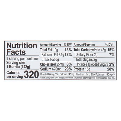 PRODUCT DETAILS: No artificial flavor or no preservatives. 15 g protein. 320 calories. Made with beef raised without antibiotics. Rolled by hand. After enjoying one of my wife Paige's delicious burrito recipes, Red (our loyal and trusted dog) and I agreed that we had to start a burrito company. Years later we are more obsessed that ever with the craft of burrito making. I hope you enjoy. - Mike. U.S. inspected and passed by Department of Agriculture. www.redsallnatural.com. Earn Red's gear 2 points. Learn how at redsallantural.com.