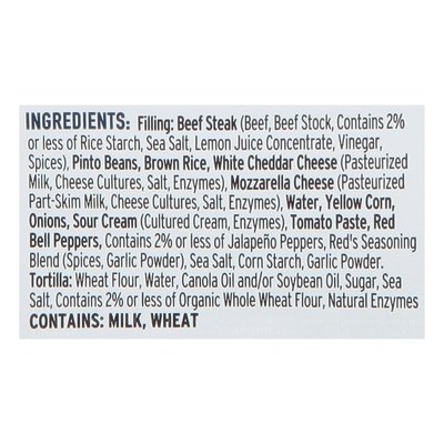 INGREDIENTS: Filling: Beef Steak (Beef, Beef Stock, Contains 2% Less of Rice Starch, Sea Salt, Lemon Juice Concentrate, Vinegar, Spices), Pinto Beans, Brown Rice, White Cheddar Cheese (Pasteurized Milk, Cheese Cultures, Salt, Enzymes), Mozzarella Cheese (Pasteurized Part-Skim Milk, Cheese Cultures, Salt, Enzymes), Water, Yellow Corn, Onions, Sour Cream (Cultured Cream, Enzymes), Tomato Paste, Red Bell Peppers, Contains 2% or Less of Jalapeno Peppers, Red's Seasoning Blend (Spices, Garlic Powder), Sea Salt, Corn Starch, Garlic Powder. Tortilla: Wheat Flour, Water, Canola Oil and/or Soybean Oil, Sugar, Sea Salt, Contains 2% or Less of Organic Whole Wheat Flour, Natural Enzymes.