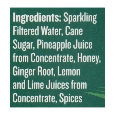 INGREDIENTS: Sparkling Filtered Water, Cane Sugar, Pineapple Juice from Concentrate, Honey, Ginger Root, Lemon and Lime Juices from Concentrate, Spices.