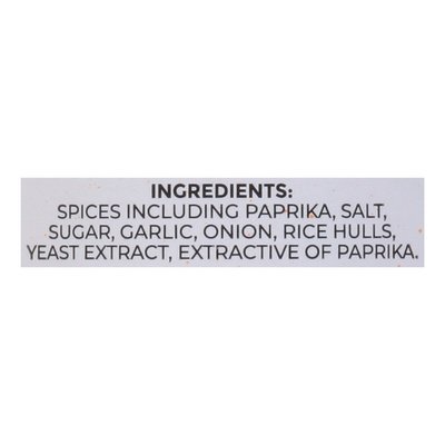 INGREDIENTS: Spices Including Paprika, Salt, Sugar, Garlic, Onion, Rice Hulls, Yeast Extract, Extractive of Paprika.