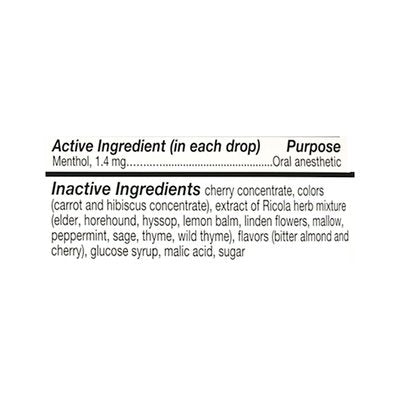 INGREDIENTS: In Each Drop: Active Ingredients: Menthol (1.4 mg), Oral Anesthetic. Inactive Ingredients: Cherry Concentrate, Colors (Carrot and Hibiscus Concentrate), Extract of Ricola Herb Mixture (Elder, Horehound, Hyssop, Lemon Balm, Linden Flowers, Mallow, Peppermint, Sage, Thyme, Wild Thyme), Flavors (Bitter Almond and Cherry), Glucose Syrup, Malic Acid, Sugar.