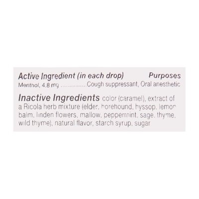 INGREDIENTS: In Each Drop Active Ingredients: Menthol (4.8 mg), Cough Suppressant, Oral Anesthetic. In Each Drop Inactive Ingredients: Color (Caramel), Extract of a Ricola Herb Mixture (Elder, Horehound, Hyssop, Lemon Balm, Linden Flowers, Mallow, Peppermint, Sage, Thyme, Wild Thyme), Natural Flavor, Starch Syrup, Sugar.