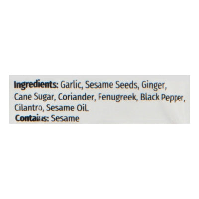 INGREDIENTS: Garlic, Sesame Seeds, Ginger, Cane Sugar, Coriander, Fenugreek, Black Pepper, Cilantro, Sesame Oil.