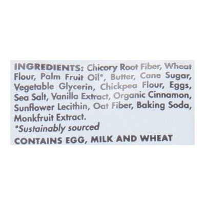INGREDIENTS: Chicory Root Fiber, Wheat Flour, Palm Fruit Oil (Sustainably Sourced), Butter, Cane Sugar, Vegetable Glycerin, Chickpea Flour, Eggs, Sea Salt, Vanilla Extract, Organic Cinnamon, Sunflower Lecithin, Oat Fiber, Baking Soda, Monkfruit Extract.