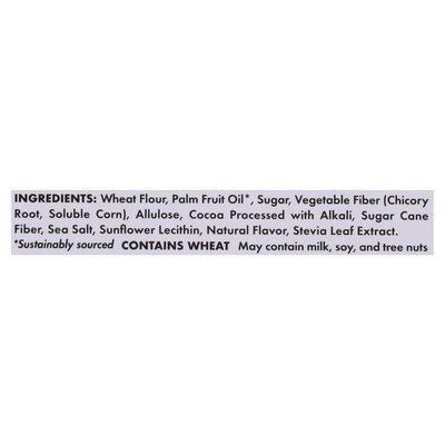 INGREDIENTS: Wheat Flour, Palm Fruit Oil (Sustainably Sourced), Sugar, Vegetable Fiber (Chicory Root, Soluble Corn), Allulose, Cocoa Processed with Alkali, Sugar Cane Fiber, Sea Salt, Natural Flavor, Baking Soda, Sunflower Lecithin, Stevia Leaf Extract.