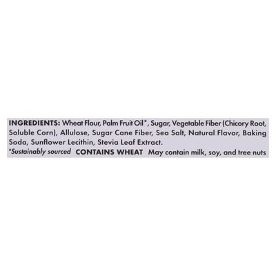 INGREDIENTS: Wheat Flour, Palm Fruit Oil (Sustainably Sourced), Sugar, Vegetable Fiber (Chicory Root, Soluble Corn), Allulose, Sugar Cane Fiber, Sea Salt, Natural Flavor, Baking Soda, Sunflower Lecithin, Stevia Leaf Extract.