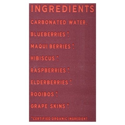 INGREDIENTS: Carbonated Water, Blueberries (Certified Organic Ingredient), Maqui Berries (Certified Organic Ingredient), Hibiscus (Certified Organic Ingredient), Raspberries (Certified Organic Ingredient), Elderberries (Certified Organic Ingredient), Rooibos (Certified Organic Ingredient), Grape Skins (Certified Organic Ingredient).