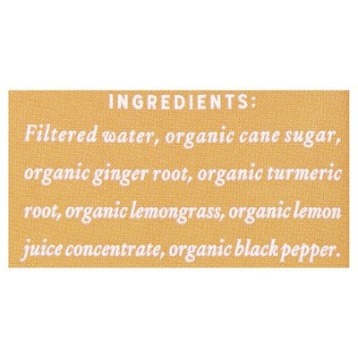 INGREDIENTS: Filtered Water, Organic Cane Sugar, Organic Ginger Root, Organic Turmeric Root, Organic Lemongrass, Organic Lemon Juice Concentrate, Organic Black Pepper.
