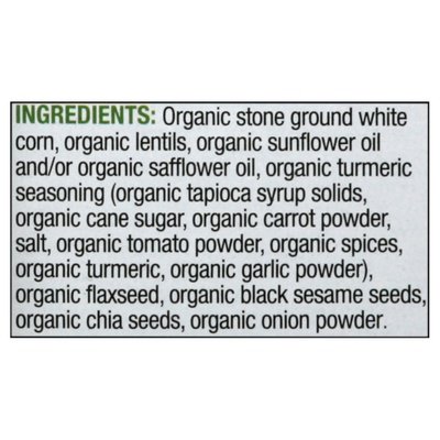 INGREDIENTS: Organic Stone Ground White Corn, Organic Lentils, Organic Sunflower Oil and/or Organic Safflower Oil, Organic Turmeric Seasoning (Organic Tapioca Syrup Solids, Organic Cane Sugar, Organic Carrot Powder, Salt, Organic Tomato Powder, Organic Spices, Organic Turmeric, Organic Garlic Powder), Organic Flaxseed, Organic Black Sesame Seeds, Organic Chia Seeds, Organic Onion Powder.