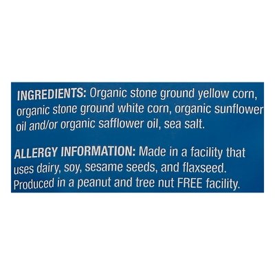 INGREDIENTS: Organic Stone Ground Yellow Corn, Organic Stone Ground White Corn, Organic Sunflower Oil and/or Organic Safflower Oil, Sea Salt.
