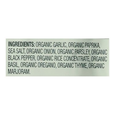 INGREDIENTS: Organic Garlic, Organic Paprika, Sea Salt, Organic Onion, Organic Parsley, Organic Black Pepper, Organic Rice Concentrate, Organic Basil, Organic Oregano, Organic Thyme, Organic Marjoram.