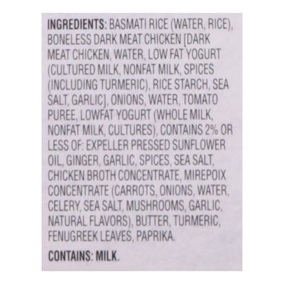 INGREDIENTS: Basmati Rice (Water, Rice), Boneless Dark Meat Chicken, Onions, Water, Lowfat Yogurt (Whole Milk, Nonfat Milk, Cultures), Tomato Puree, Contains 2% or Less of: Expeller Pressed Sunflower Oil, Garlic, Ginger, Spices, Sea Salt, Native Rice Starch, Chicken Broth Concentrate, Mirepoix Concentrate (Carrots, Onions, Water, Celery, Sea Salt, Mushrooms, Garlic, Natural Flavors), Turmeric, Unsalted Butter, Red Chili Peppers, Fenugreek Leaves, Paprika.